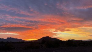 We’re battening down the hatches today as heavy rains and flash flooding are predicted in Quartzsite. I made a cherry cheesecake yesterday, and invited Matt and his dog Sunshine to come over and eat cheesecake, drink coffee and play board games until the storm passes.