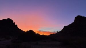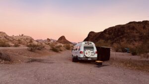 I’m not travelling as light as I once did; I have two sets of solar suitcases, an outdoor table and chair, an awning and sides for it. I also have lots of solar lights that I collected when I was in Quartzsite. Setup at a new spot means not only getting level, but also trying to get my driver’s side facing south (that’s where the solar suitcases plug into the van) and I also want to leave a clear space on the passenger side for my awning to go out. Wind direction is also a factor as I like to keep my awning on the opposite side of the van from the wind direction. (Any sailors? Help me out with terminology here.) I managed all of the above when we pulled in near Kingman, and by the time Matt got set up, he came over to help me with my awning, only to find I not only got the awning out on my own, but also put up the sides and lights. He seemed surprised and maybe a tad pleased that he’d taught me well.