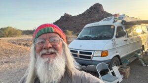 Matt makes my life easier on so many levels. He loves to grill, so he cooks many meals that we share, or if he’s eating meat, I’ll supply some veggies and veggie burgers, and he’ll gladly throw them on the grill and cook them for me. We eat most meals together. He also makes ‘water runs’ for us both, driving his OHV down to the nearby Love’s Truck Stop and filling a large bladder with water and then driving back up the hill and pumping it into my freshwater tank. That saves me from having to tear down and drive my van to fill my tank. He takes me for rides through the desert on dirt roads that I would have thought impassable. I was scared on some of our early expeditions back in October in the mountains surrounding Quartzsite, but Matt’s an excellent driver, even on the most dubious of roads. I always feel safe. He’s been a good friend and I’m so glad our paths keep intertwining. He’ll soon head back to Michigan for the summer and I definitely will not be meeting him up there. But I’ll bet we will reconnect in the fall when he heads south again.