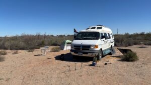 In order to get level, I ended up with the driver’s side facing south. My solar suitcases happen to be on that side, so it makes pointing them toward the sun a simple task. As it happened, the side where my double doors are and where the awning and my “spare room” get set up were facing a large patch of creosote, palo verde, and various other small trees. I often leave those doors open and sit outside there, so it felt very private to have no other rigs in that direction, at least not that I could see. It was not too far to walk to the hot springs, and I settled in. Cosmo and I took a walk and then I headed over to the hot springs where I ran into Chad, a man I’d met here last year. He called me by name. I had to ask his as his face was familiar but I couldn’t remember his name. We chatted for a long time in the hot tub. I had hoped to meet Matt here. He was here last week, but drove to Yuma for supplies and found a spot there. A part of me misses him immensely; another part is happy to be on my own again and reconnecting with friends from past years.