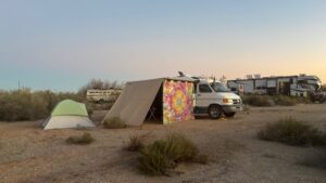 When I came home, I easily got set up in my same spot, marked by the two leveling blocks for my front tires. I put out my solar suitcases, and set up my awning with sides. I’ve thought of this as a chore in the past, but today, I felt I had all the time in the world. No place to be, nothing else that needs to be done for probably a week to 10 days. It was the first time I set it up by myself. I’ve always had Matt to help me in the past. I not only managed, but finished with a smile on my face, feeling pretty self-satisfied that I pulled it off without a hitch.