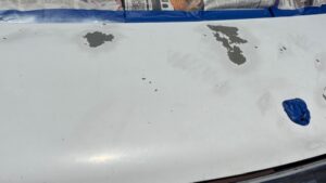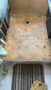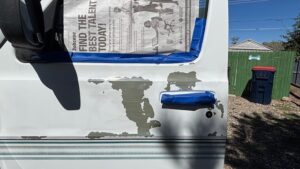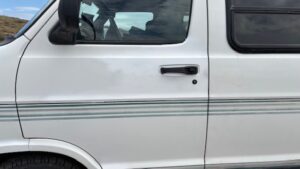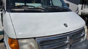 I spent most of the week in Barbara and Lark’s driveway. I wasn’t feeling particularly motivated, but I managed to get more work done on the van (and on me and Cosmo too) than I have in past stays. I sanded down the spots on my van where the original paint was peeling off and re-sprayed them with plain white Rust-oleum. I thought it would be better than huge grey spots, but I didn’t expect it to turn out as well as it did.