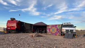 Tie Dye Bob was there with his kids, and so was DJ Matt and Devon who owns a bus that looks like a pirate ship, complete with masts and sails. Others who I recognize but don’t know by name came and talked with us. Jen came with a basket of pot cookies and mushroom chocolates. Matt and I each ate half of a mushroom chocolate. The fire burned a little brighter. After a while, our friends were leaving one by one, and Matt wanted to go back to check on Sunny. We went back to our vans, walked the dogs and then took his side-by-side back to the fire, which was dwindling and another one was lit closer to DJ Matt’s bus where there was a cleared space and people were dancing and juggling fire. The mushroom chocolate kicked in and Matt and I both realized almost simultaneously, that the crowd had shifted from the old folks who we knew, to a much younger crowd.  He said to me “Is it OK if we go home and have our own fire?”  I replied, “You read my mind.” We went back to our compound, sat under the EZ up tent and Matt lit his propane fire pit. We took turns exchanging life stories and laughing.  Lots of laughing. I felt a closeness to Matt that I’ve not felt with anyone for a long time.