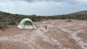 I drove over to the opposite side of town, and went down a dirt road where the great camping spots were supposed to be. I got to the end of the road where there was a gate with a keypad. I wasn’t going to get any farther, so I backtracked and explored several side roads. I found a couple clearings, level enough for me to camp, but they seemed pretty trashed. One had the remnants of a Lazy Boy recliner, and the other was littered with shotgun casings. The sky in the south was black, and a huge storm was heading toward us and I could hear a combination of gunshots and thunder nearby. I decided to not risk getting washed away or shot, and headed back to my safe place off Bloody Basin Road.